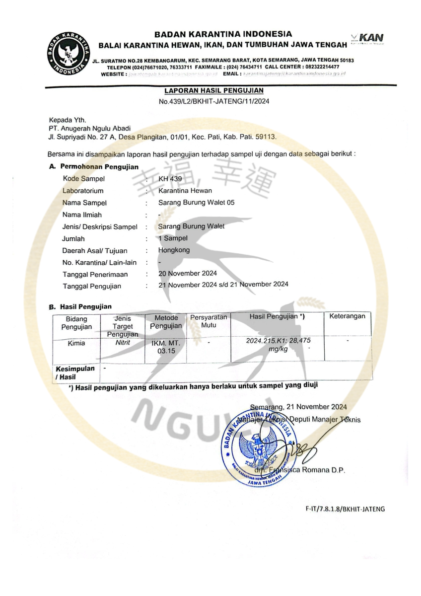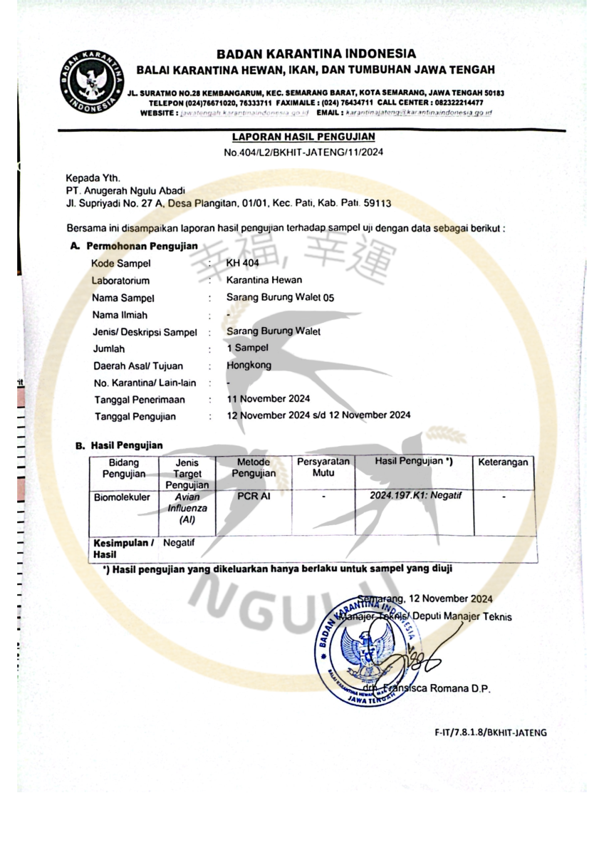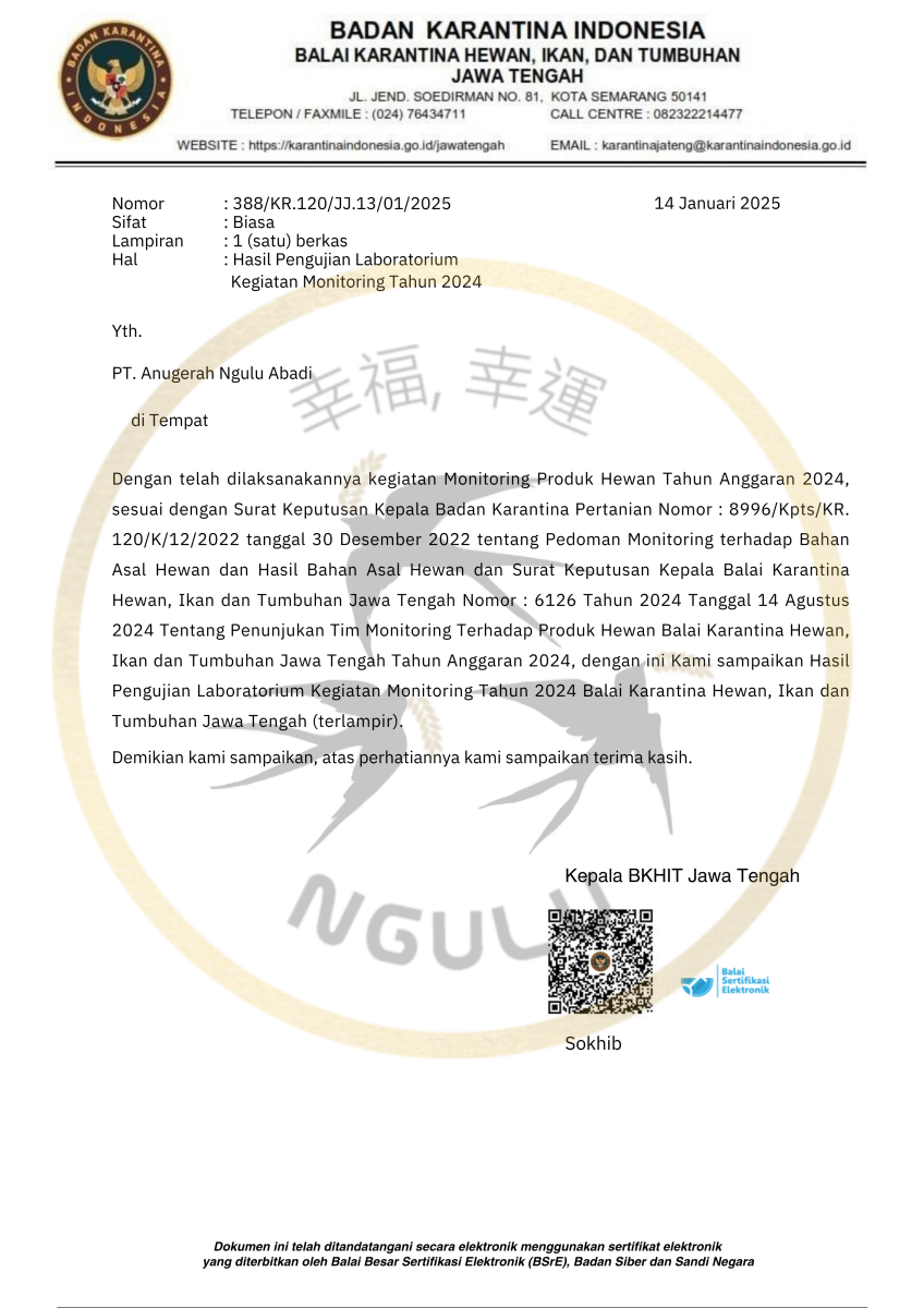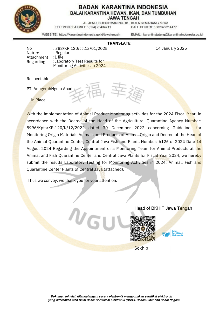 We are also actively monitored by the Central Java Animal, Fish, and Plant Quarantine Agency. Their laboratory is also national accredited. These are our laboratory test result from them.